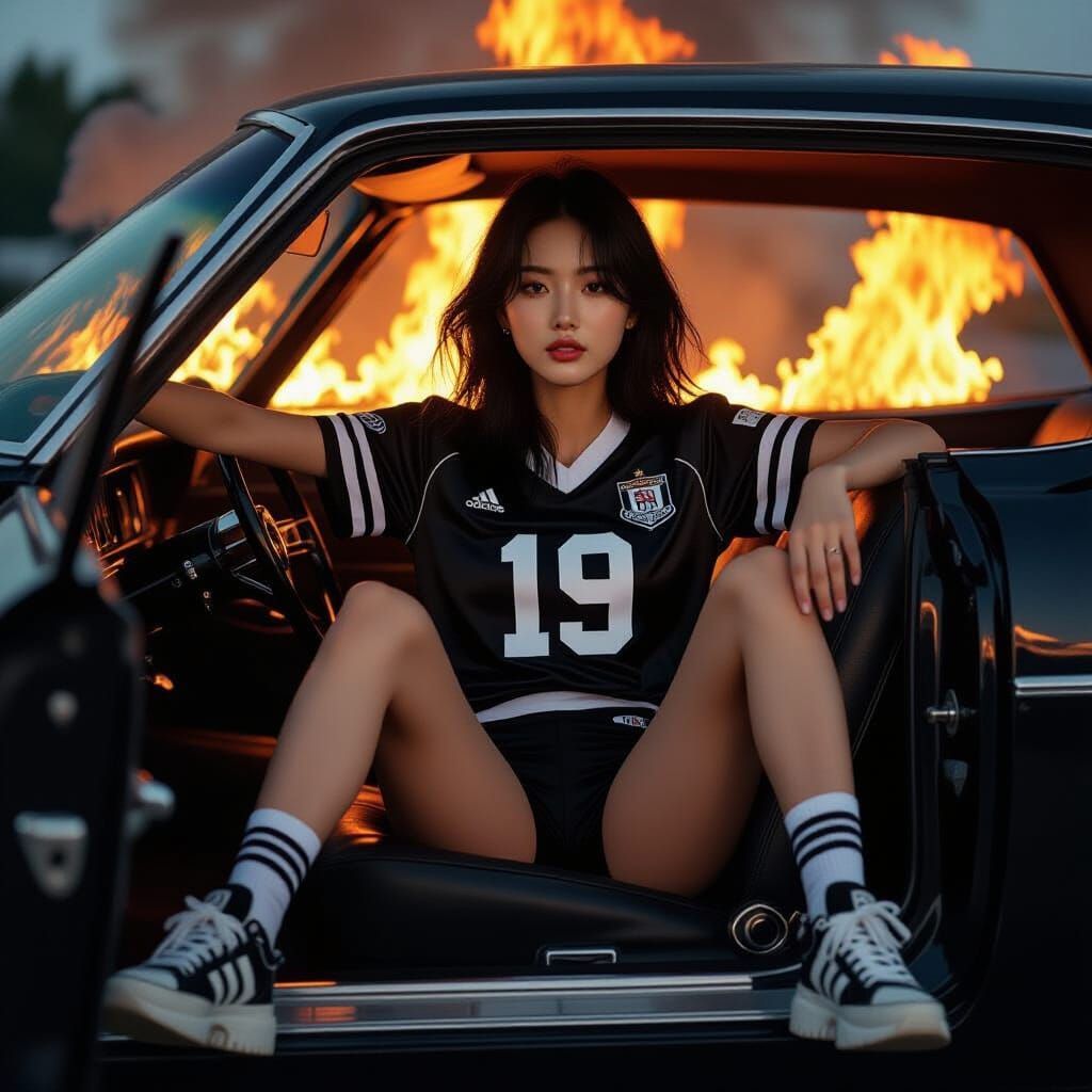 A striking picture of a young Korean woman in a vintage car engulfed in flames. The image features dramatic lighting and gritty textures in a cinematic style.