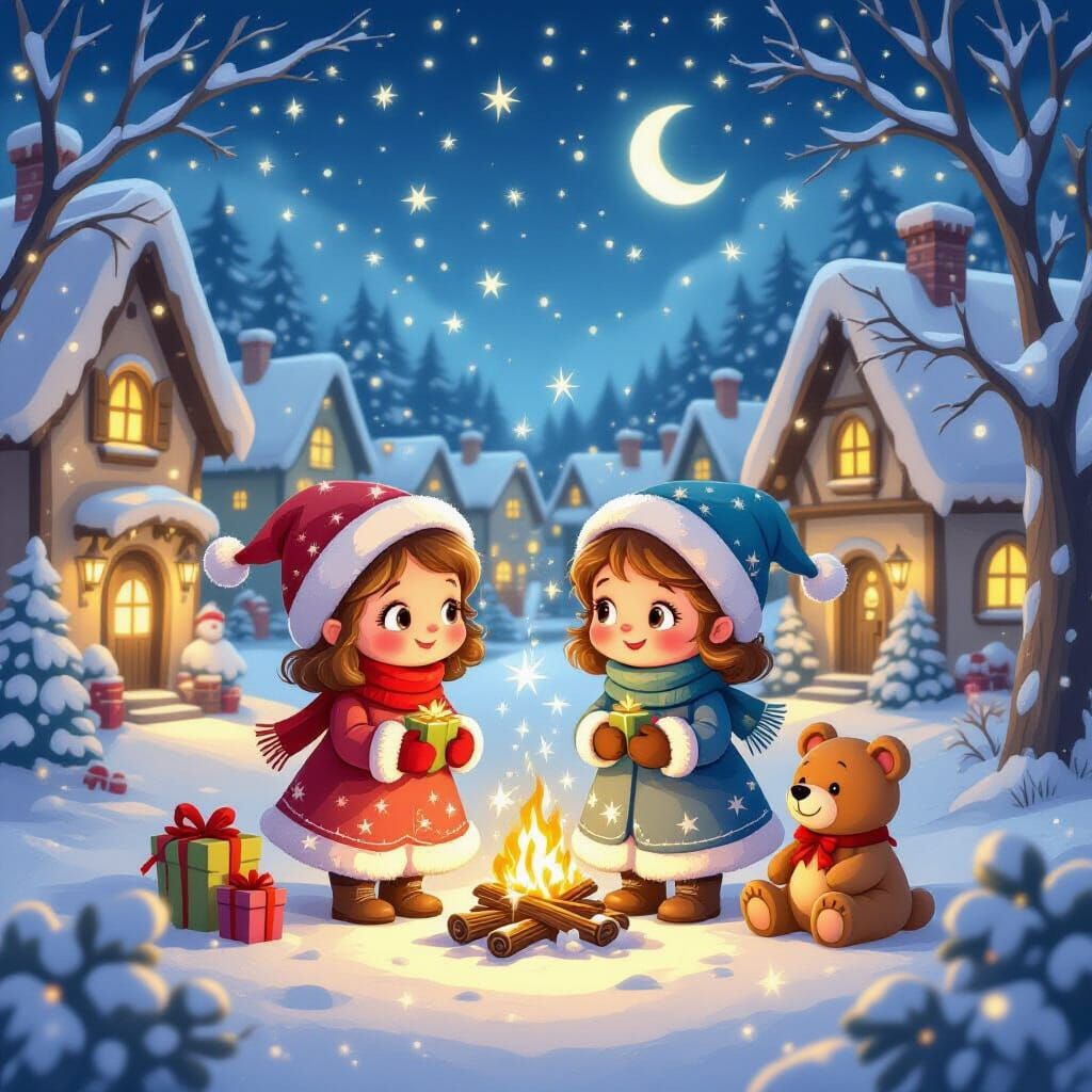 A charming fantasy illustration of Christmas dolls adorned with stars and surrounded by magical toys like flying dragons and glowing teddy bears in a cozy, snowy village.