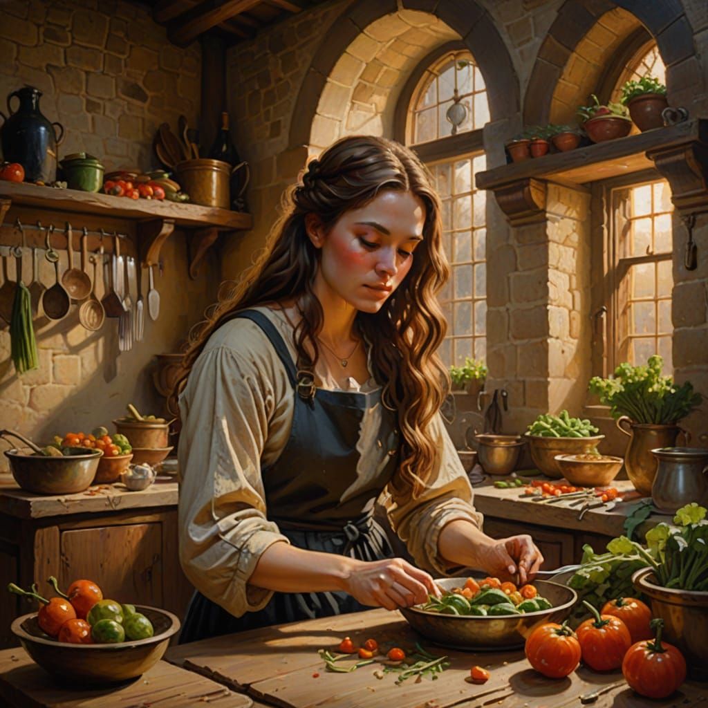 This image shows a young woman with long brown hair preparing a meal in a medieval kitchen. The scene is rendered in warm, earthy tones with soft brushstrokes, evoking a cozy and realistic atmosphere as an impressionist painting.