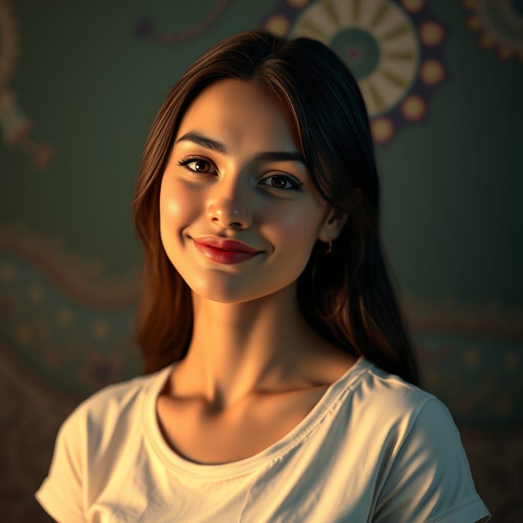 This stunning image features a confident young woman with a warm smile, set against a vibrant and blurred background. The hyper-realistic style showcases intricate details and a triadic color palette, reminiscent of Alphonse Mucha's works. The dramatic lighting and 3D volumetric effects create a sense of...