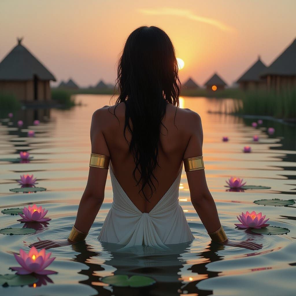 This image shows a woman rising from the Nile at dusk, her skin wet and shining. She wears a white linen dress and golden bracelets, with lotus blossoms floating nearby in an art nouveau style.