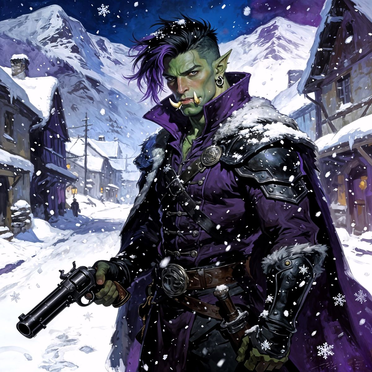 This image depicts a handsome, athletic half-orc rogue with striking green skin and distinctive hair, holding a large pistol on a snowy village street. He wears a purple doublet, armor, and a cloak.