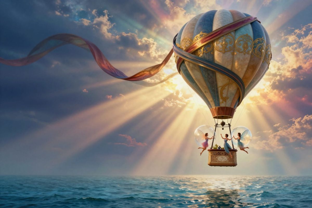This image showcases fairies dancing in globes next to a vintage hot air balloon adorned with ribbons. It features a hyperrealistic fantasy style with Art Nouveau influences, set against a radiant ocean and dramatic sky.