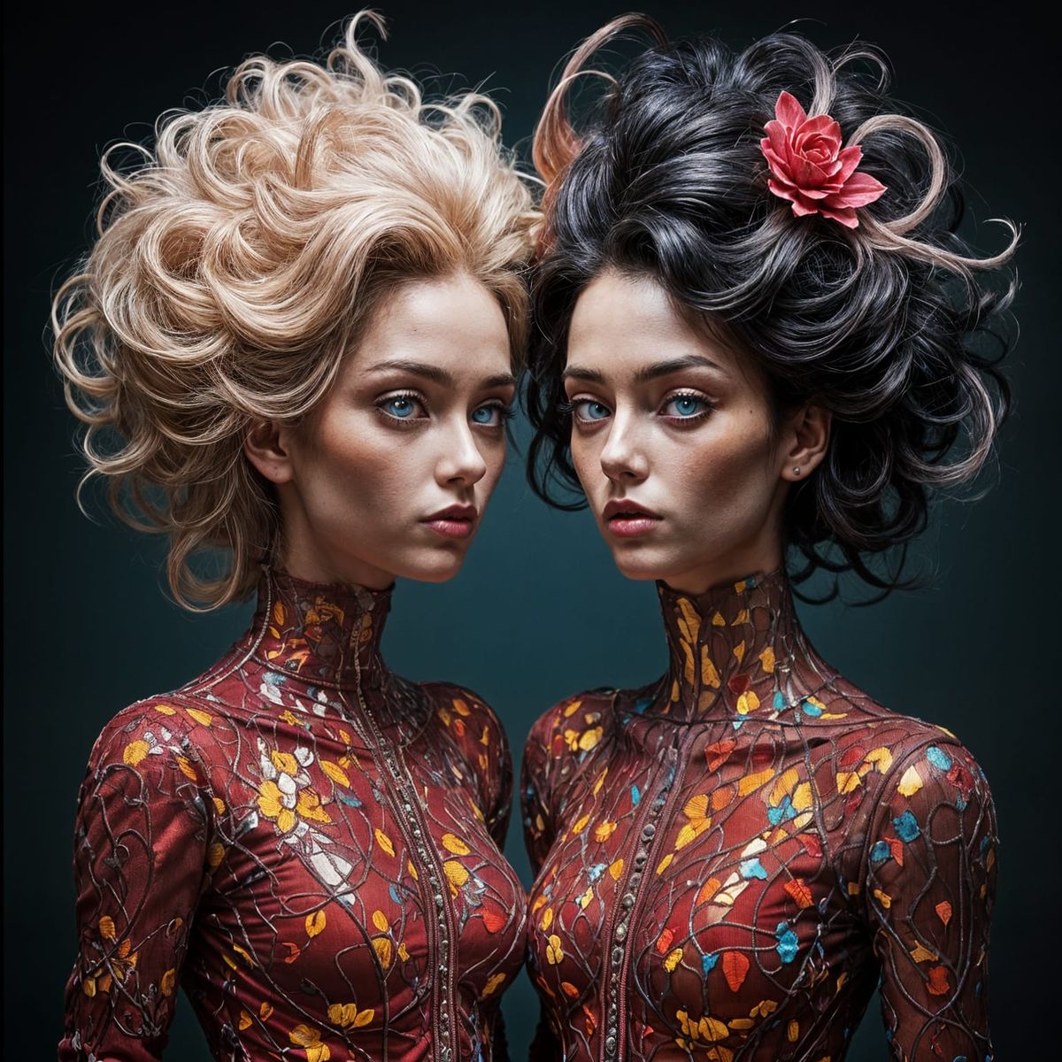 This image depicts two volumetric dolls with intricate velvet attire, one with blonde hair and blue eyes, the other with black hair and brown eyes, set against a softly lit background with deep, velvety shadows, characteristic of a futuristic and surrealist aesthetic.