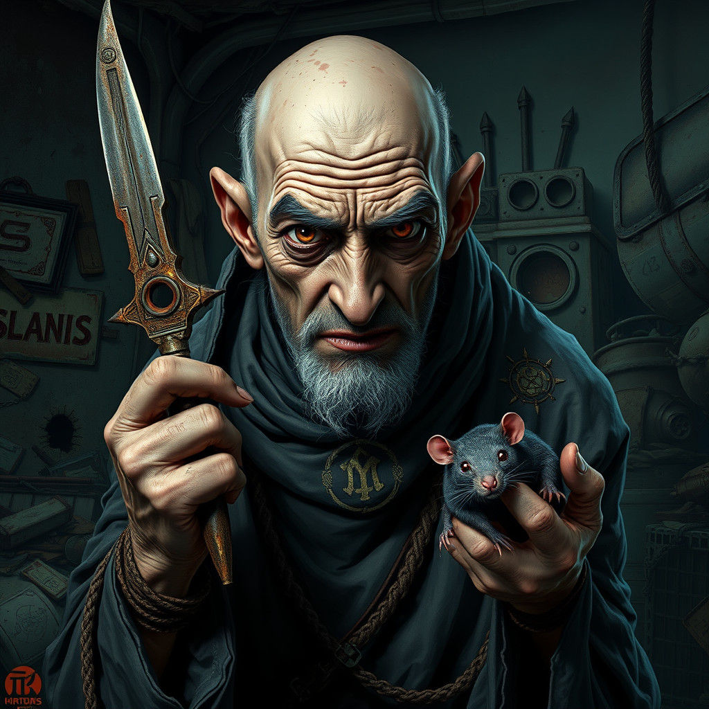 A disturbing image of an old, balding man in ragged robes, holding a scalpel and dead rat, set against a post-apocalyptic backdrop. The scene is rendered with 2D and 3D elements in a dark, rich color palette.