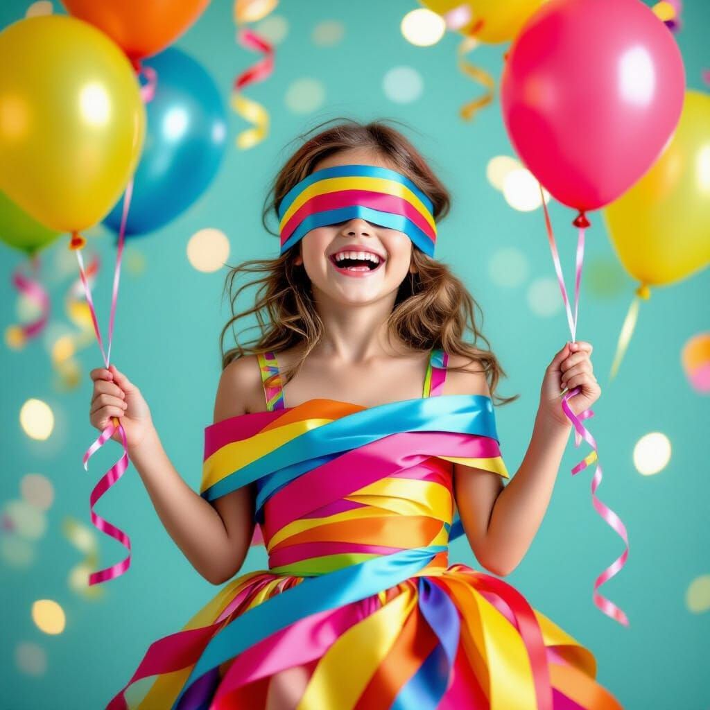 This image shows a young girl blindfolded and wrapped in colorful paper, awaiting her birthday presents. The photograph features a bokeh effect and bright, high-contrast colors.