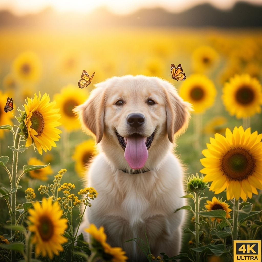 A golden retriever puppy sits in a field of sunflowers, tongue out and smiling, bathed in warm sunlight. Butterflies flutter nearby with a soft bokeh background, reminiscent of whimsical pet photography.