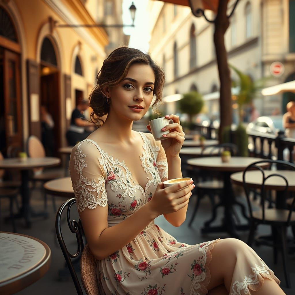 A sun-drenched cafe scene depicts a woman in an elegant vintage dress enjoying espresso in Rome. The image evokes a nostalgic, cinematic quality with a soft, golden light.