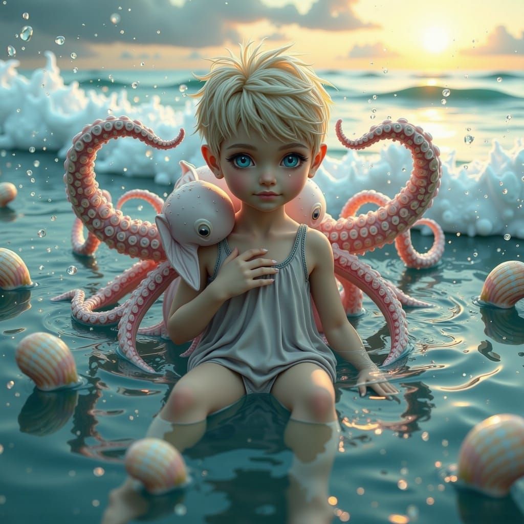 A vivid image shows a child with blonde hair and blue eyes in a teal ocean, embraced by an octopus. This hyper-realistic image is reminiscent of golden-hour paintings with glistening skin and detailed textures.