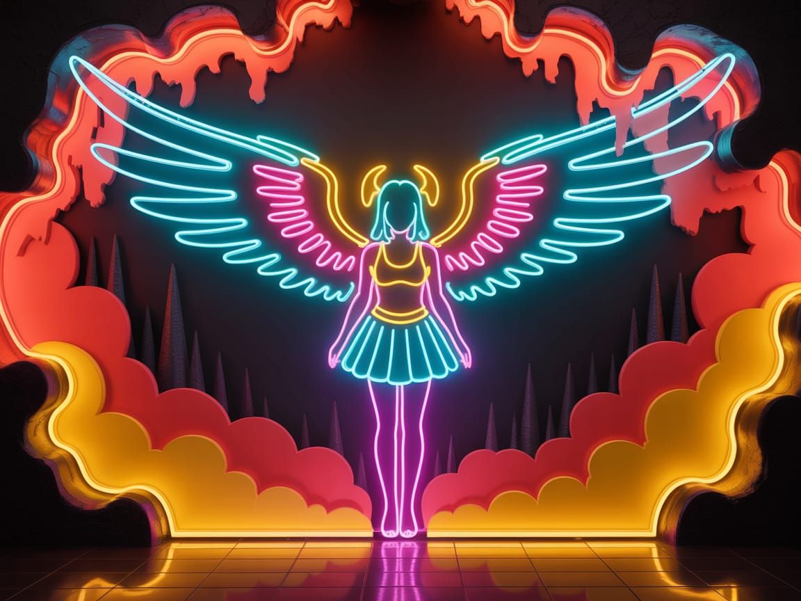 A striking picture of a neon silhouette of a half-demon angel girl with wings. The background shows a hellish landscape lit by red and orange neon, rendered as detailed fantasy neon art.