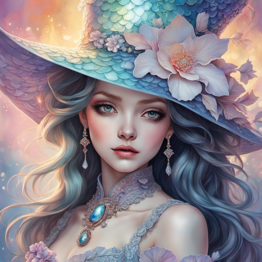 A digital painting of a woman wearing a large hat, up close. The image features iridescent textures and glittering scales, with soft lighting and pastel colors, in a fantasy art style.