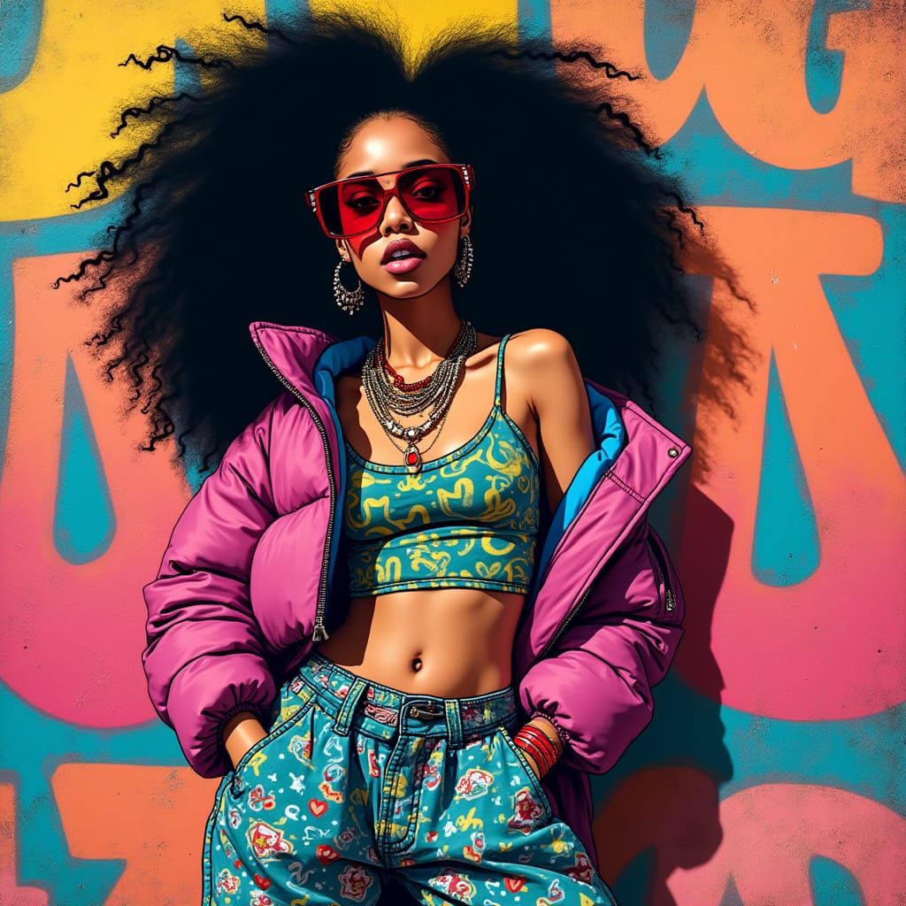 A vibrant pop art illustration of a young woman with neon hair and confident stance, set against a vivid graffiti wall, blending elements of street fashion and fine art.