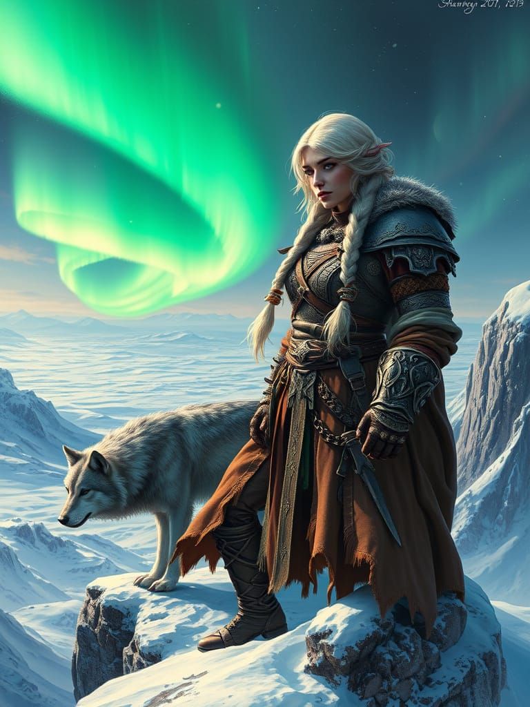 A powerful barbarian queen surveys her frozen domain from a high cliff, accompanied by her direwolf. The image features dramatic lighting and intricate details, with a cinematic feel.