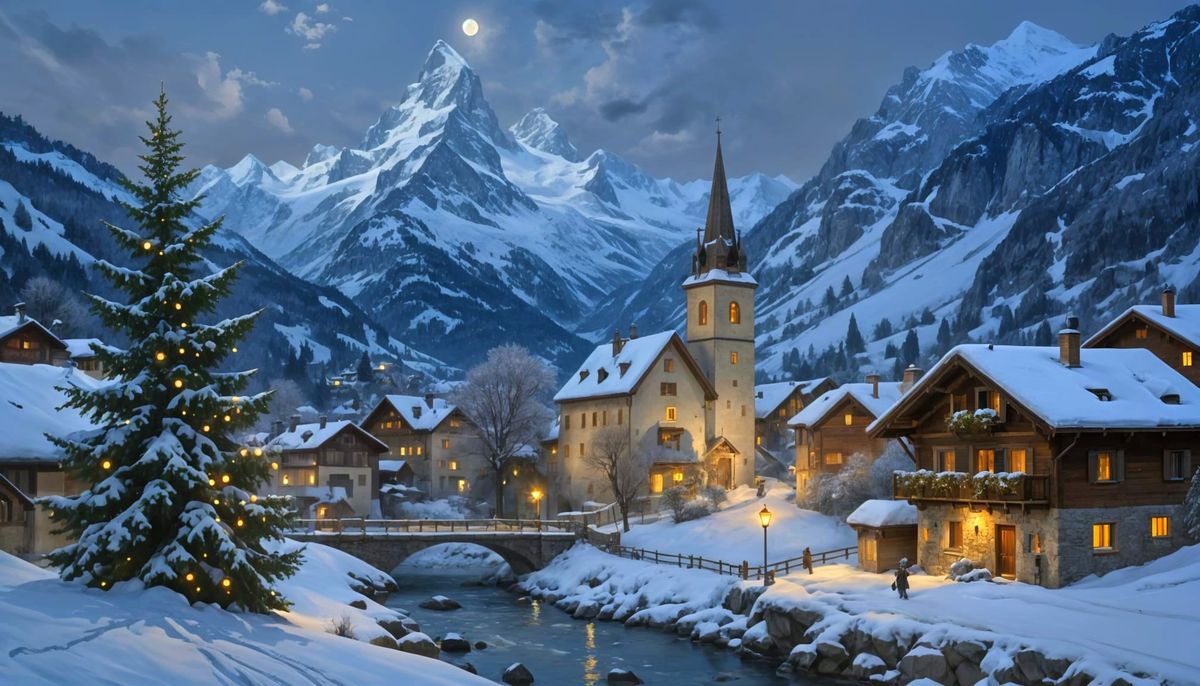 This image shows a hyper-detailed, expressive oil painting of a Swiss village at night, featuring a decorated fir tree and snow-capped Alps. The scene evokes tranquility with soft lighting and warm lanterns.