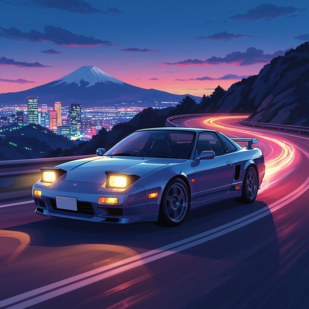 A dynamic illustration of a classic 1989 Japanese sports car on a mountain road at twilight, featuring bold linework and vibrant neon lights in an anime art style.