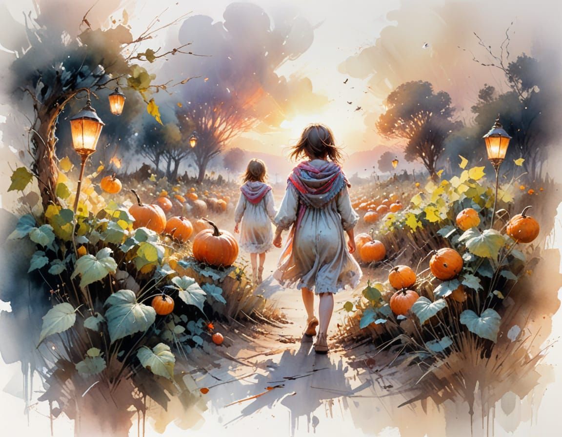 A nostalgic harvest scene featuring children in scarves amidst glowing lanterns and pumpkin vines at sunset. Rendered with soft, textured brushwork and warm golden hour light.