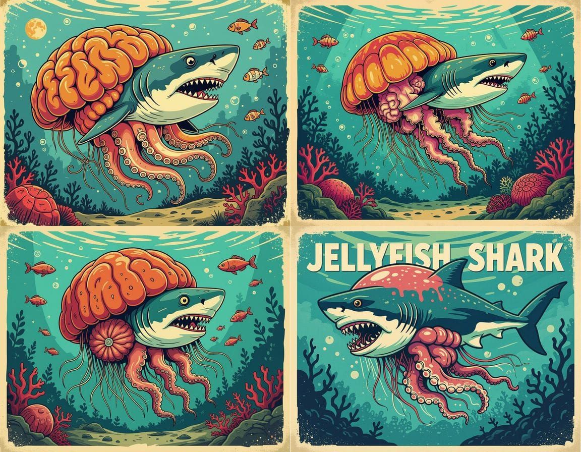 This image depicts a disturbing hybrid of a jellyfish and shark, with exposed underwater organs. Rendered in a muted color palette with bold outlines, evoking a 1950s horror movie poster style.