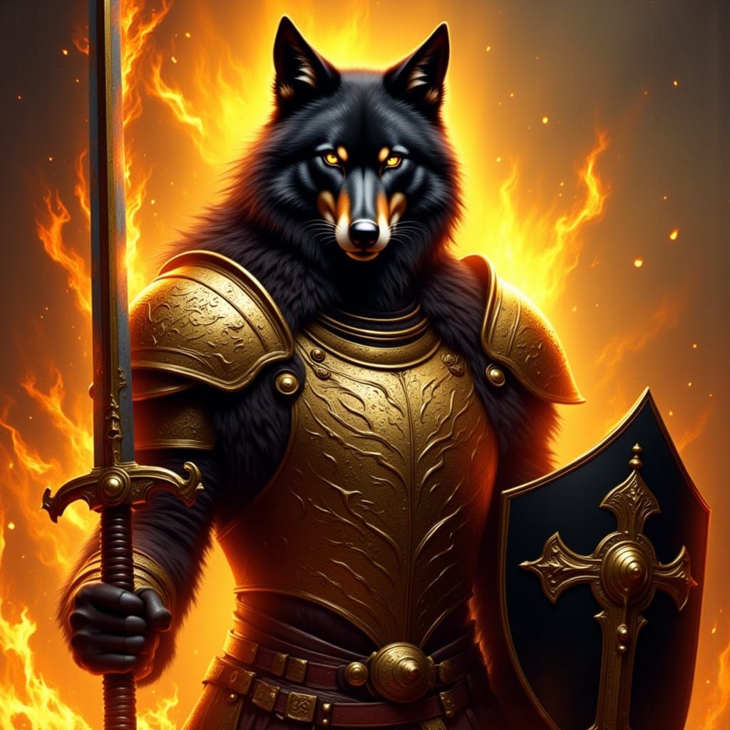 This image shows a black wolf in golden armor holding a flaming sword and shield. The wolf is set against a background of large flames and bright light, rendered in a digital painting style.