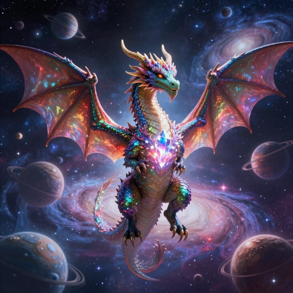 This image shows a majestic, rainbow-scaled dragon flying through vibrant outer space with celestial bodies and galaxies. Features a glowing crystal in its chest, rendered in a fantastical digital art style.