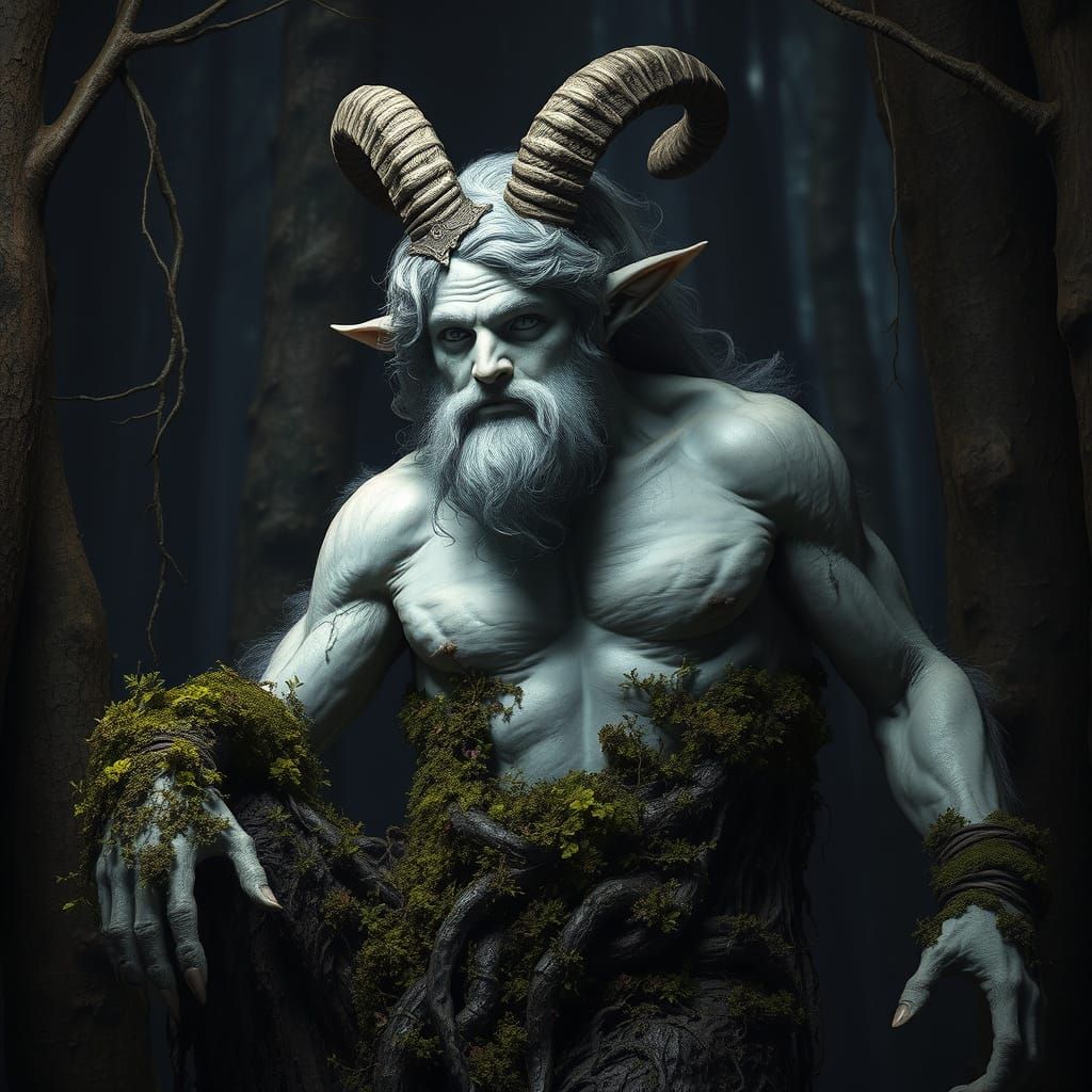 This image shows a white satyr in a dark forest. The upper half is a handsome human with curly hair, while the lower half is a goat covered in mud and vines. Rendered as dark fantasy concept art.