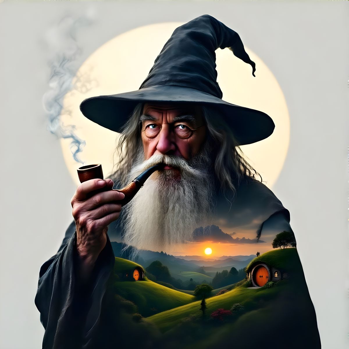 This image features a mystical double exposure art piece of Gandalf in a serene Shire landscape, blending elements of nature and fantasy with a soothing, late-day sun glow.