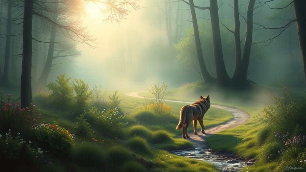 This oil painting depicts a lone wolf on a path through a foggy spring forest. Sunlight filters through, highlighting flowers and a stream, rendered with textured brushstrokes and luminous light.