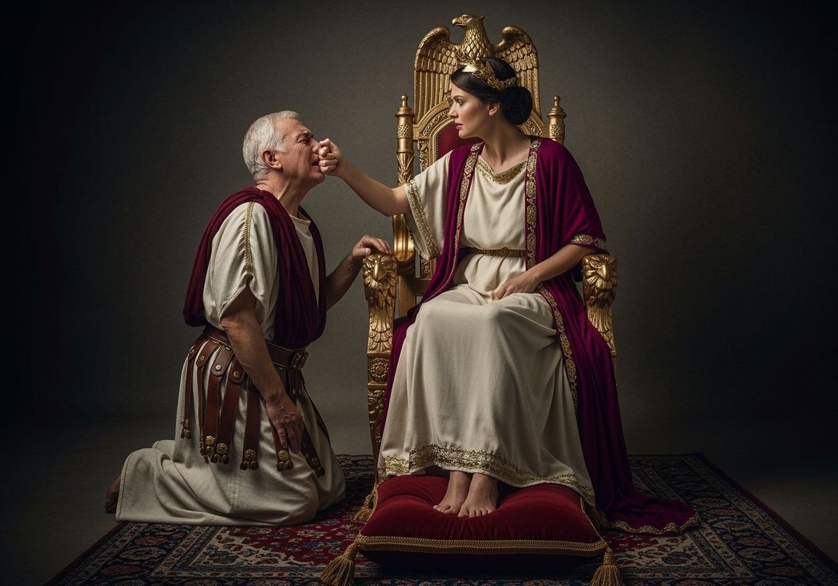 This image depicts a Roman Empress in imperial robes, barefoot on her throne. She is slapping a kneeling senator. The image is photorealistic with a shallow depth of field.