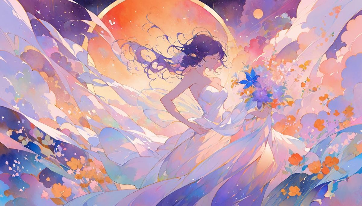 This image shows ethereal female figures in a dreamy watercolor painting. Sensual and introspective nymphs blend innocence and allure against a bold sunset, in a style reminiscent of fashion illustration.