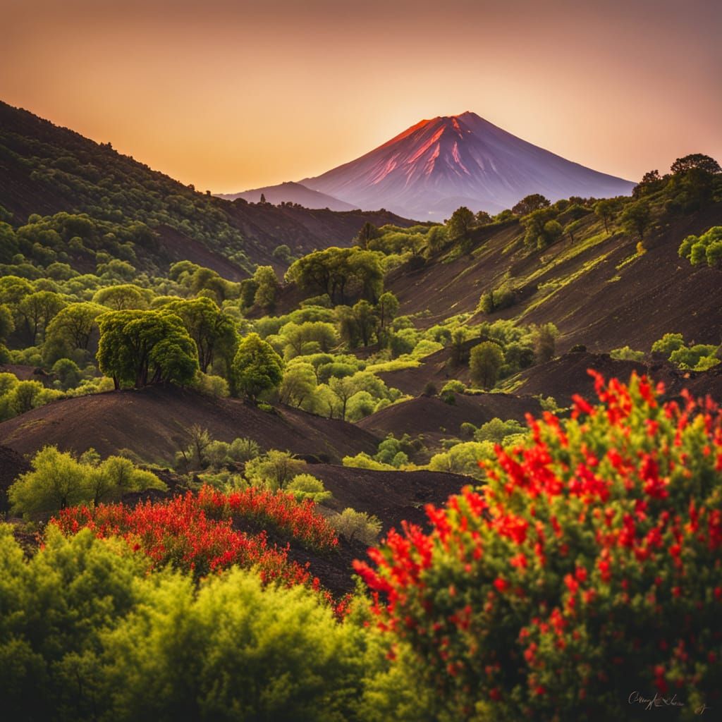 This image shows Mount Etna in Italy during golden hour. Lush green trees surround the dramatic volcanic landscape, captured with vibrant colors and soft bokeh in high resolution.