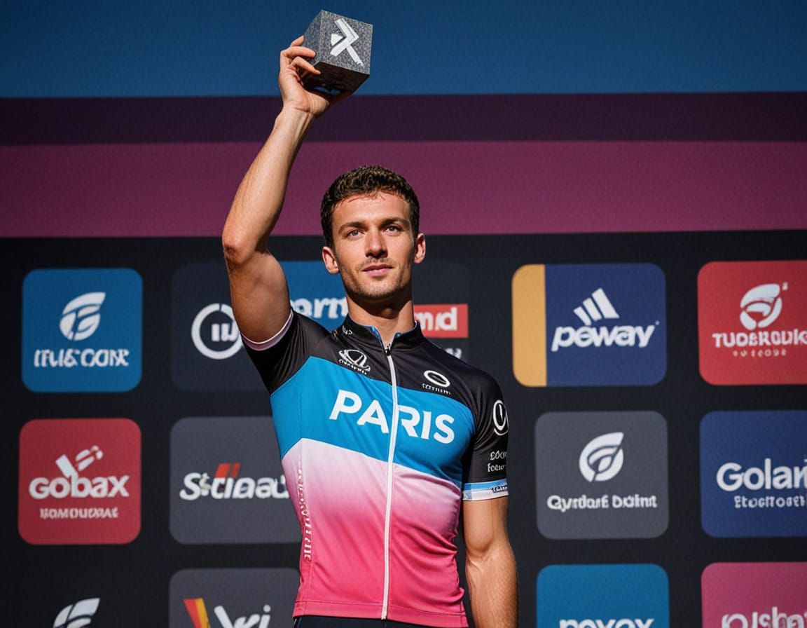This image captures a triumphant moment in sports, with a young cyclist proudly holding a granite cube aloft on the winners podium, surrounded by vibrant colors and bold typography, set against a stunning pink and dark-lila gradient background