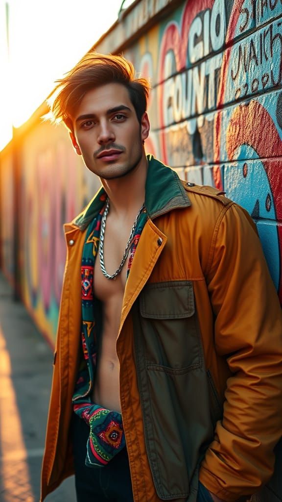 This image captures a stylish male model in a colorful layered outfit, standing confidently near a vibrant graffiti wall, bathed in warm golden hour light, with a shallow depth of field and sharp focus, reminiscent of a high-end fashion photograph