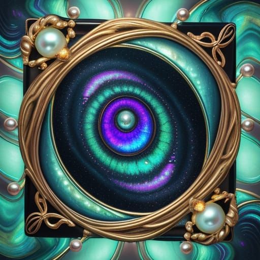 A surreal close-up of glowing glass pearls and labradorite swirling in abstract forms. This dreamlike oil painting features iridescent colors and melting shapes with vibrant, luminescent hues in a surreal style.
