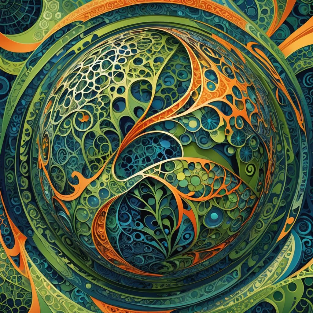 This image shows a minimalist globe featuring a wave-like symbol and Zentangle patterns, rendered with vibrant colors and a dynamic, 3D shaded effect. Inspired by geometric and optical art.