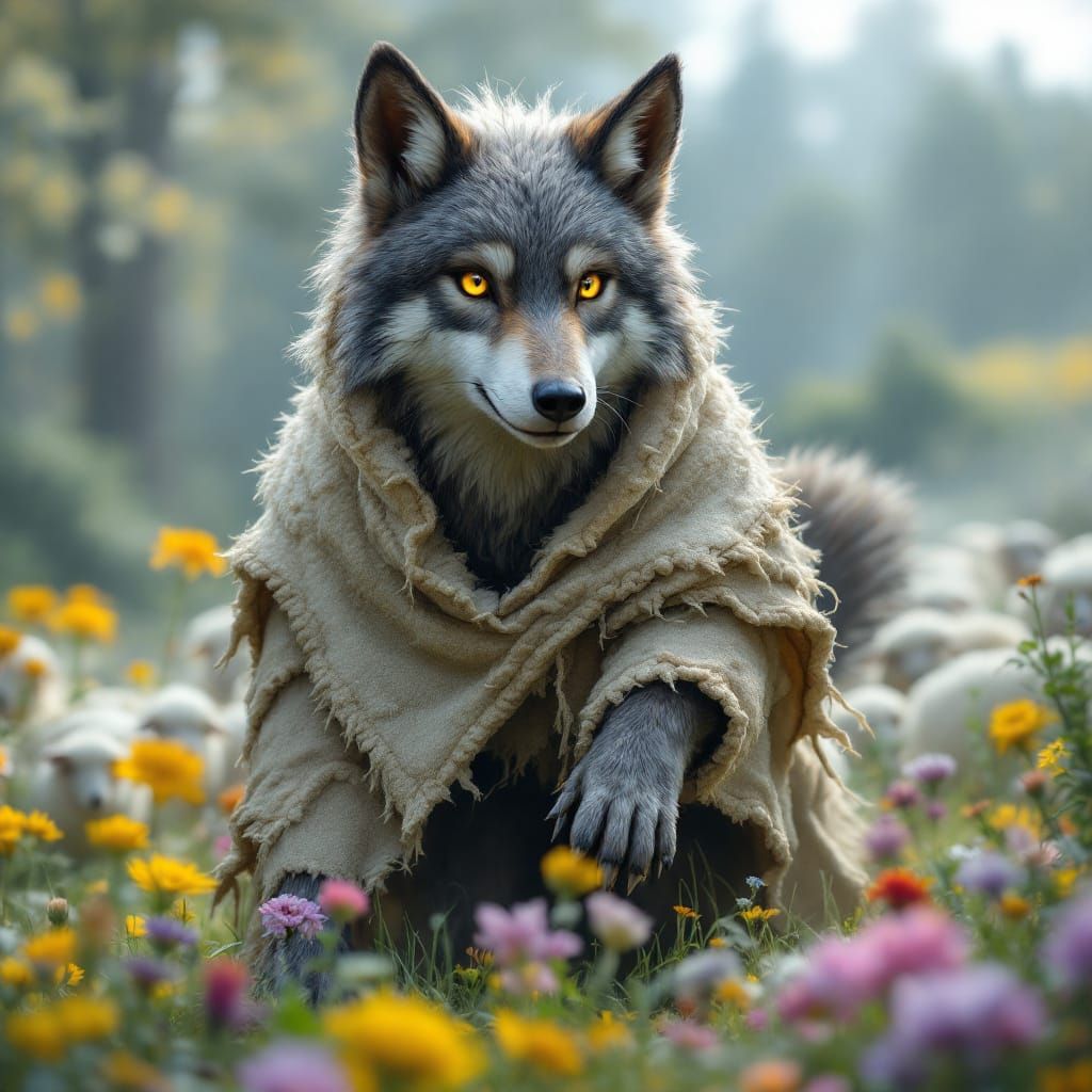 This whimsical painting depicts a sly wolf in a tattered sheep costume, trying to blend into a sunny meadow. Hints of wolf fur and fangs peek through the disguise, observed by a curious sheepdog.