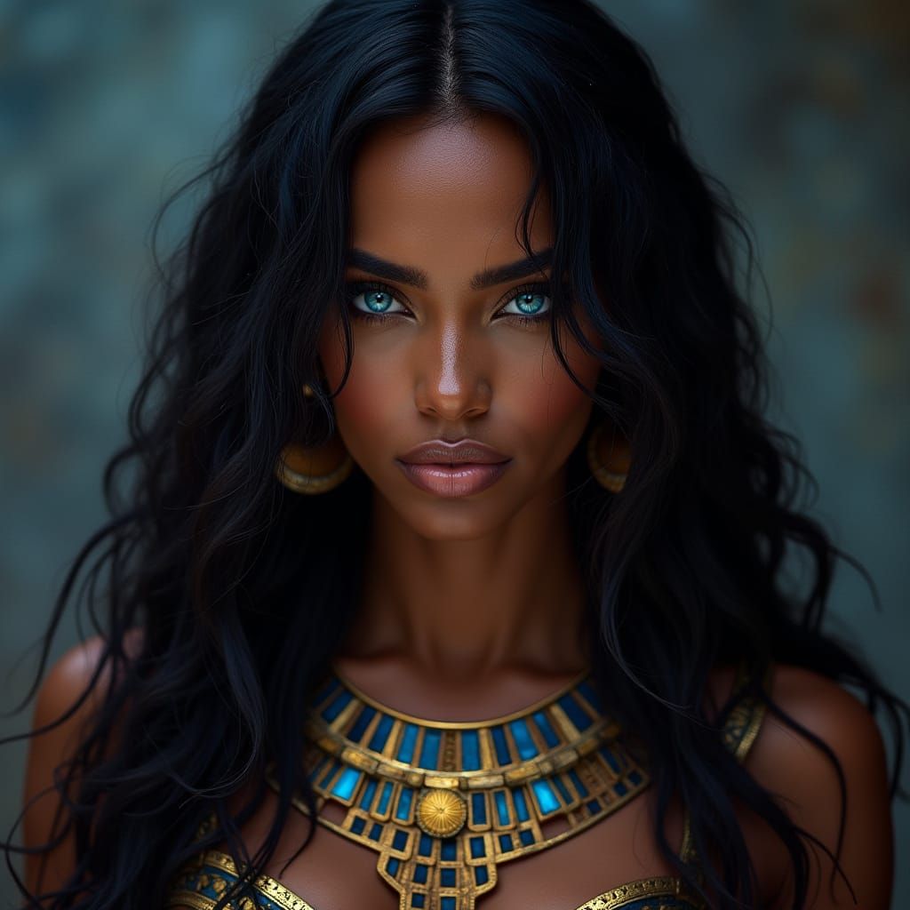 This image shows a stunning portrait of a Black woman as an Egyptian warrior angel. She has flowing hair, blue eyes, and wears golden armor, set against a cosmic backdrop, rendered with hyperrealism.