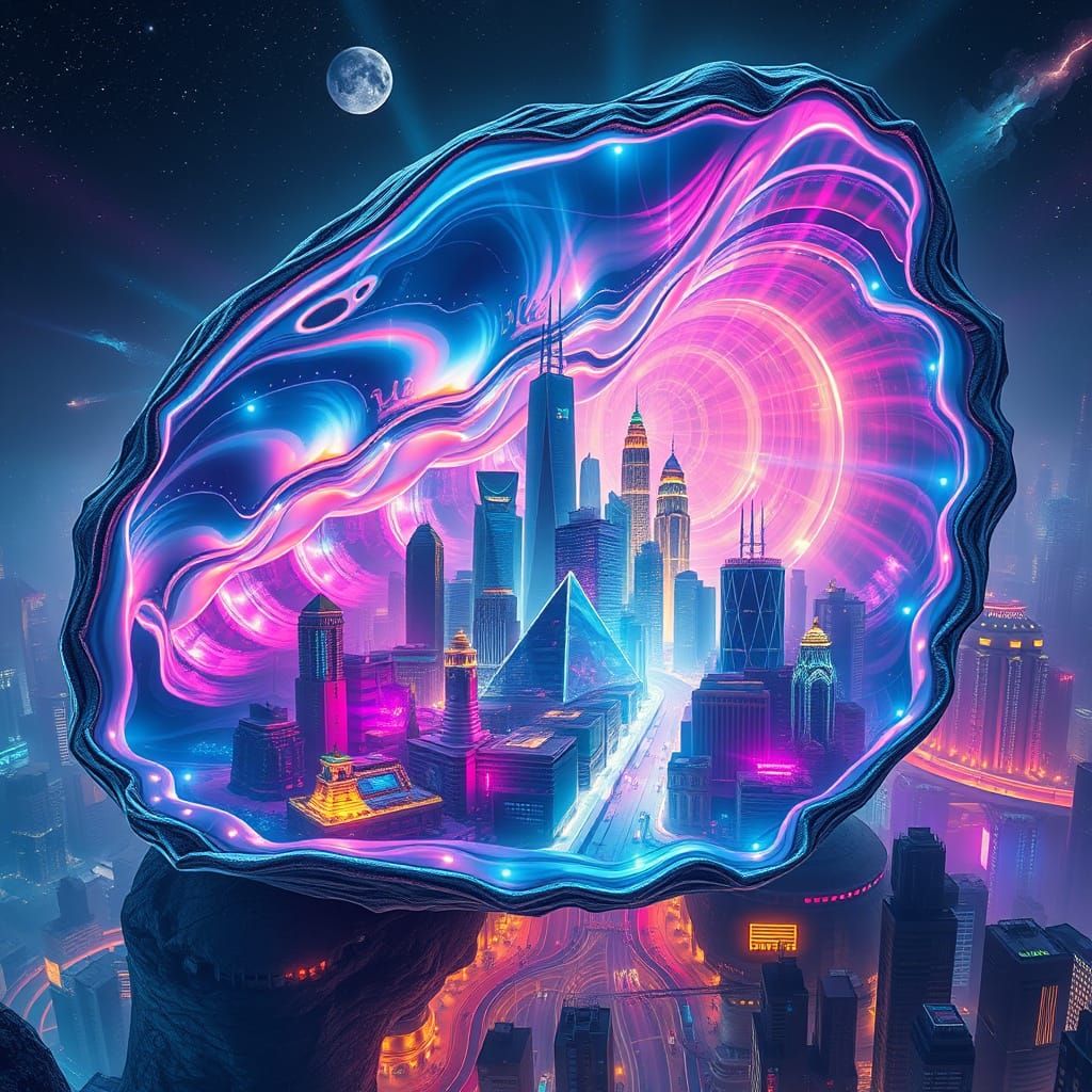 A cyberpunk cityscape emerges from the swirling curves of a gargantuan oyster shell, blending traditional and digital art with intricate details and textures, radiating an otherworldly glow.
