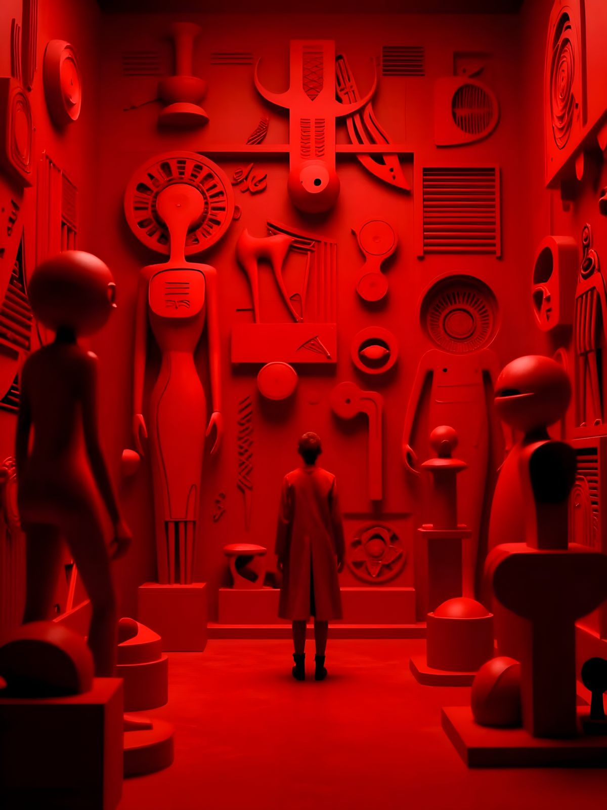 This image showcases a monochromatic crimson red scene with stylized, cartoonish elements. Rendered with cinematic lighting and intricate details, it features conceptual shapes and patterns.