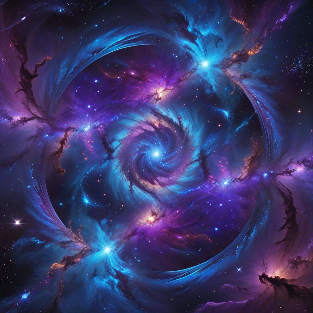 This image shows the Mirror of the Cosmos reflecting galaxies and nebulas. The digital art features swirling purple nebulae, glowing blue star patterns, and vibrant colorful fractals in a symmetrical composition.