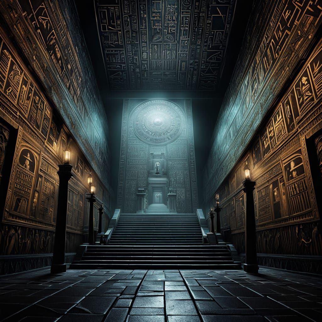 This image shows Nefruma ahnk mau within a mysterious Egyptian pyramid sanctuary. Walls are adorned with hieroglyphs and desert inscriptions, illuminated by dramatic cinematic lighting. Rendered in a hyperrealistic art nouveau style with intricate details.