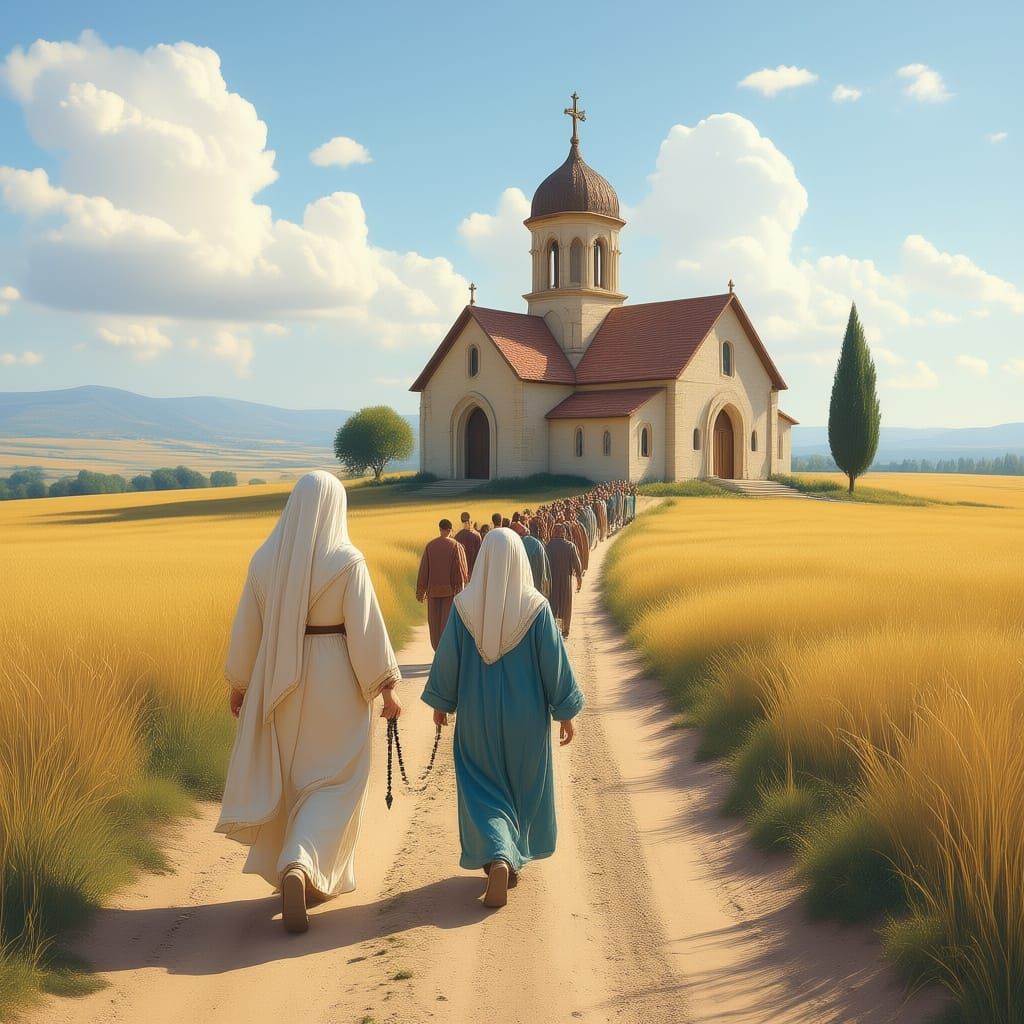This image depicts Mary, mother of Jesus, walking on a dirt road toward a Synagogue, followed by a procession. Rendered as a detailed matte painting with deep, complementary colors and intricate fantasy elements.
