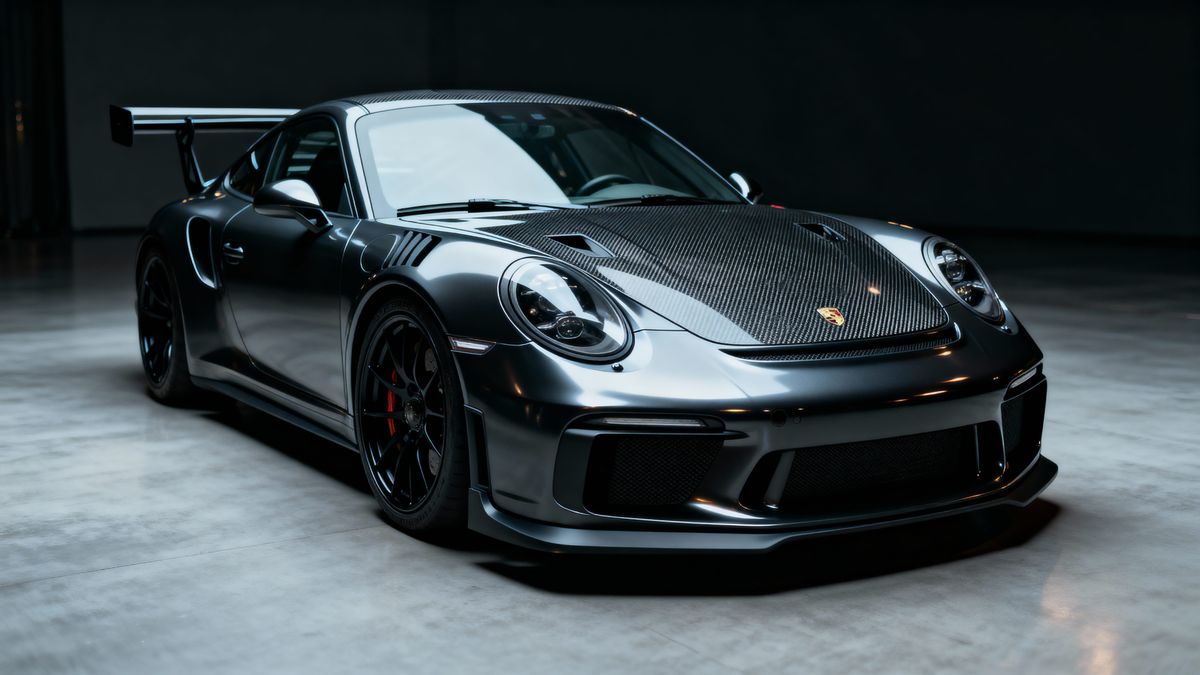 This ultra-realistic photograph showcases a modified metallic black Porsche with a carbon fiber hood, wide body kit, and large rear wing, captured in a studio with cinematic lighting.