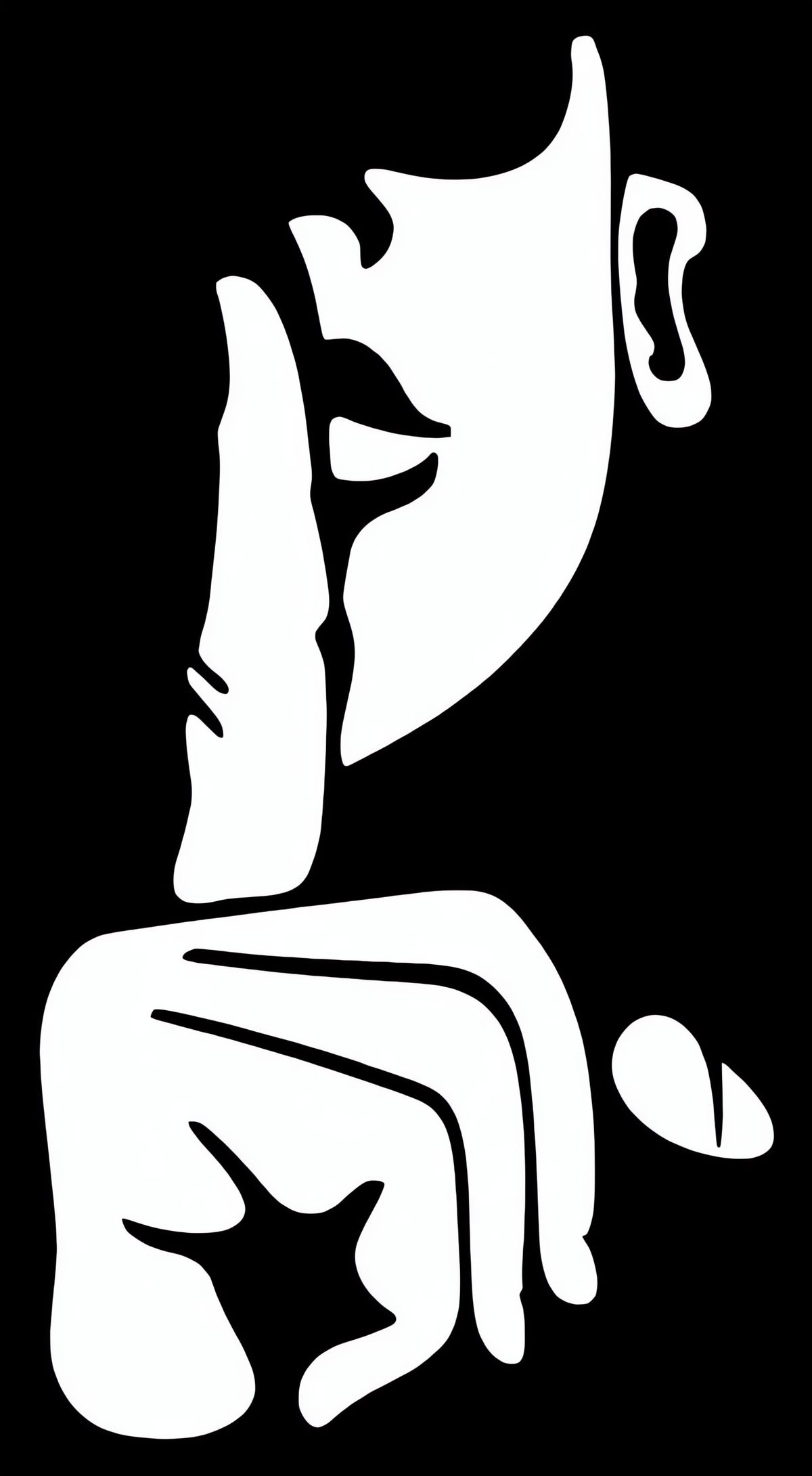 This image shows a minimalist black and white silhouette of a person gesturing 'shh' with a finger over their lips. The design features clean, bold shapes and strong contrast, ideal for DTF printing.