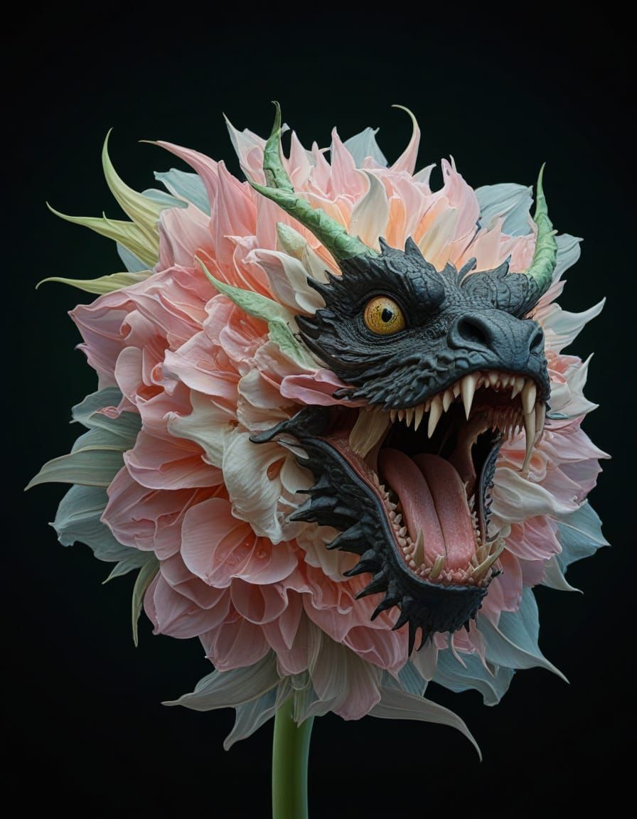 This image shows a surreal close-up of a black Asian dragon depicted as a flower. The portrait features delicate petals and a vibrant green stem, rendered with soft, ethereal lighting and pastel colors in a dreamlike, mystical style.