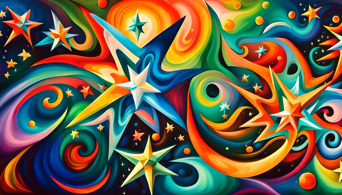 A vibrant image showcasing five swirling, pointy stars amidst electromagnetic plasma coils. The background reveals a myriad of stars, all rendered in a rich, impasto oil painting style with vivid colors.
