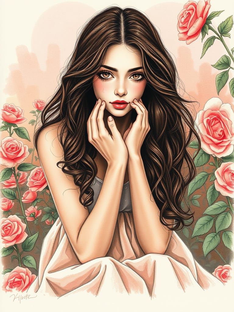 This image depicts a young woman in a state of poignant vulnerability, surrounded by the lush beauty of a rose garden, in a delicate and emotive rough color pencil sketch reminiscent of Egon Schiele's expressive style