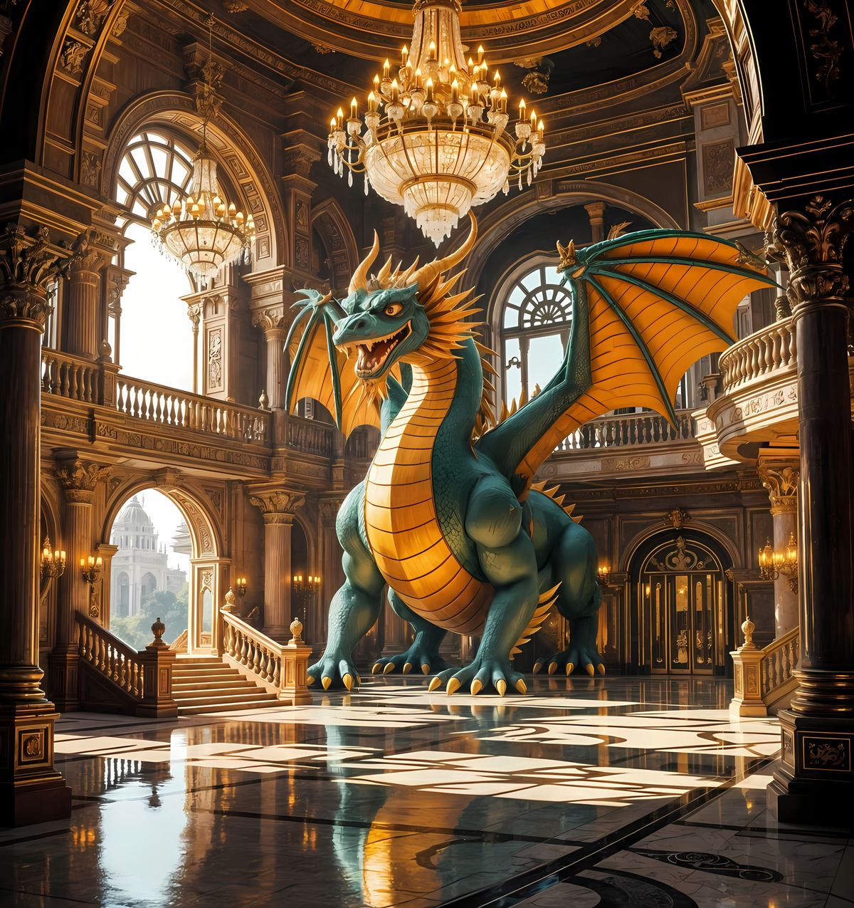 A digital rendering of a futuristic grand palace in Mumbai, India, featuring ornate balconies and crystal chandeliers. A colossal, friendly dragon guards the palace, which blends traditional Indian design with sci-fi elements in 8k.