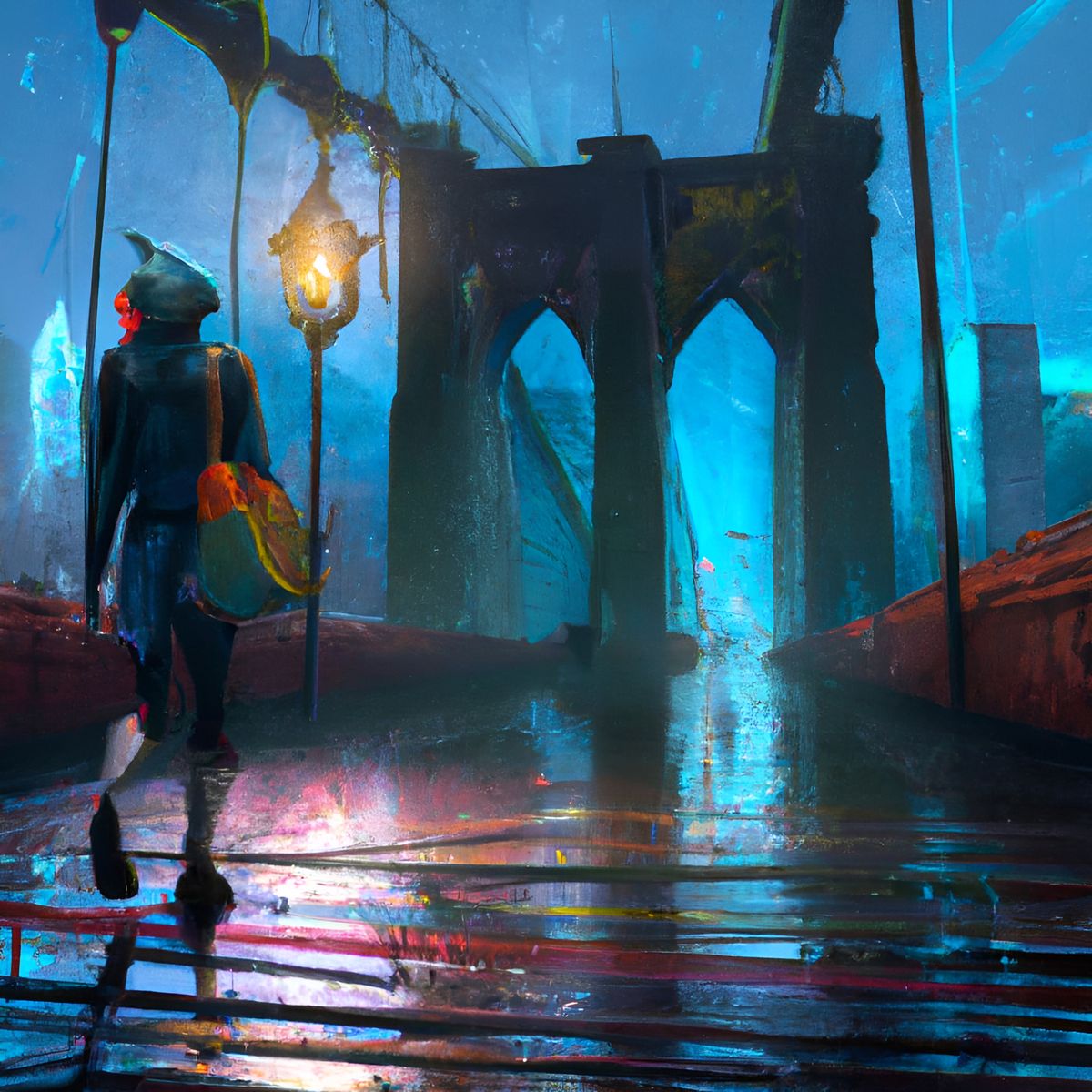 This image shows a melancholic woman walking on the Brooklyn Bridge on a rainy night. The image is a detailed matte painting with deep colors and intricate details, reminiscent of fantasy concept art.