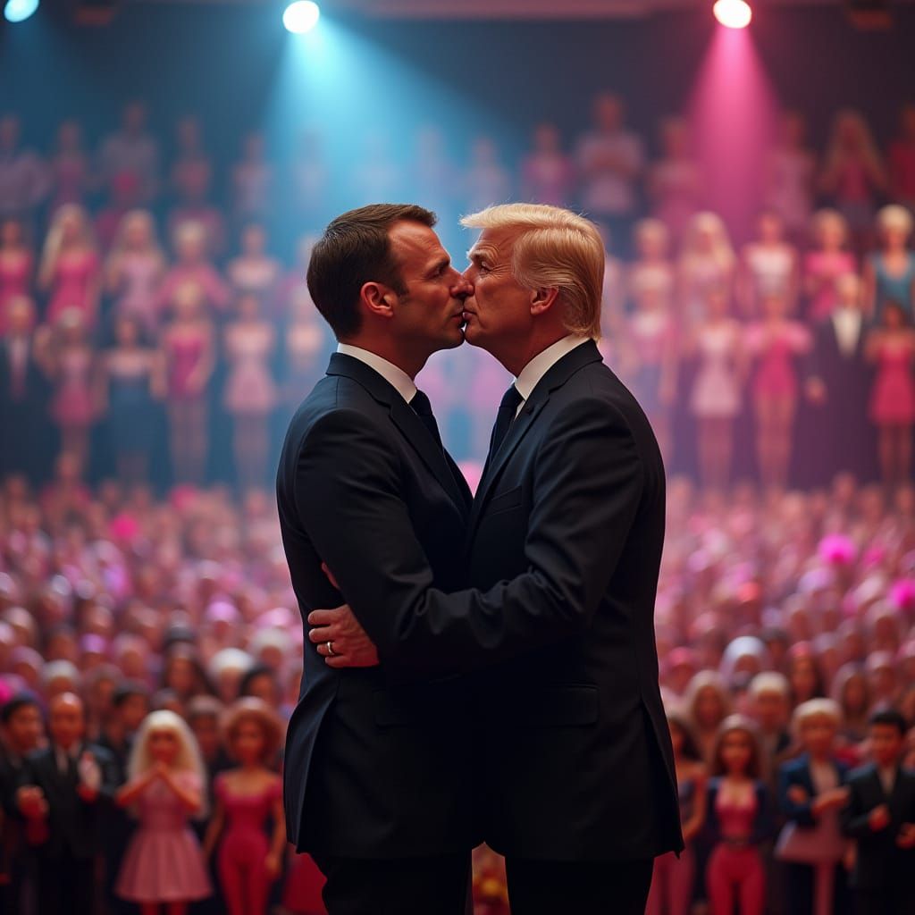 This image captures a surreal moment of French President Emmanuel Macron tenderly kissing a large photo of Donald Trump, surrounded by a cheering crowd and a vibrant exhibition of Barbie dolls, with a cinematic aesthetic and high-contrast colors reminiscent of epic film stills.