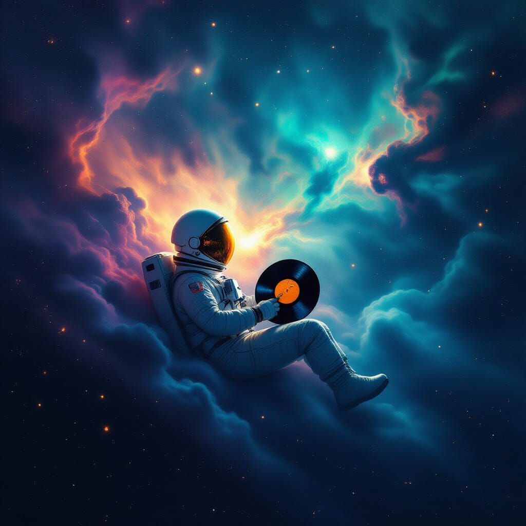 This hyperrealistic image captures an astronaut floating in a cosmic expanse of violet and gold, holding a vintage vinyl record. It evokes solitude and nostalgia within a cinematic, atmospheric scene.