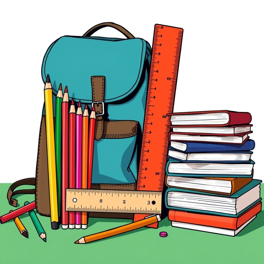 A vibrant arrangement of school supplies including pencils, a backpack, ruler, and books. The image features geometric patterns, expressive lines, and bold colors.
